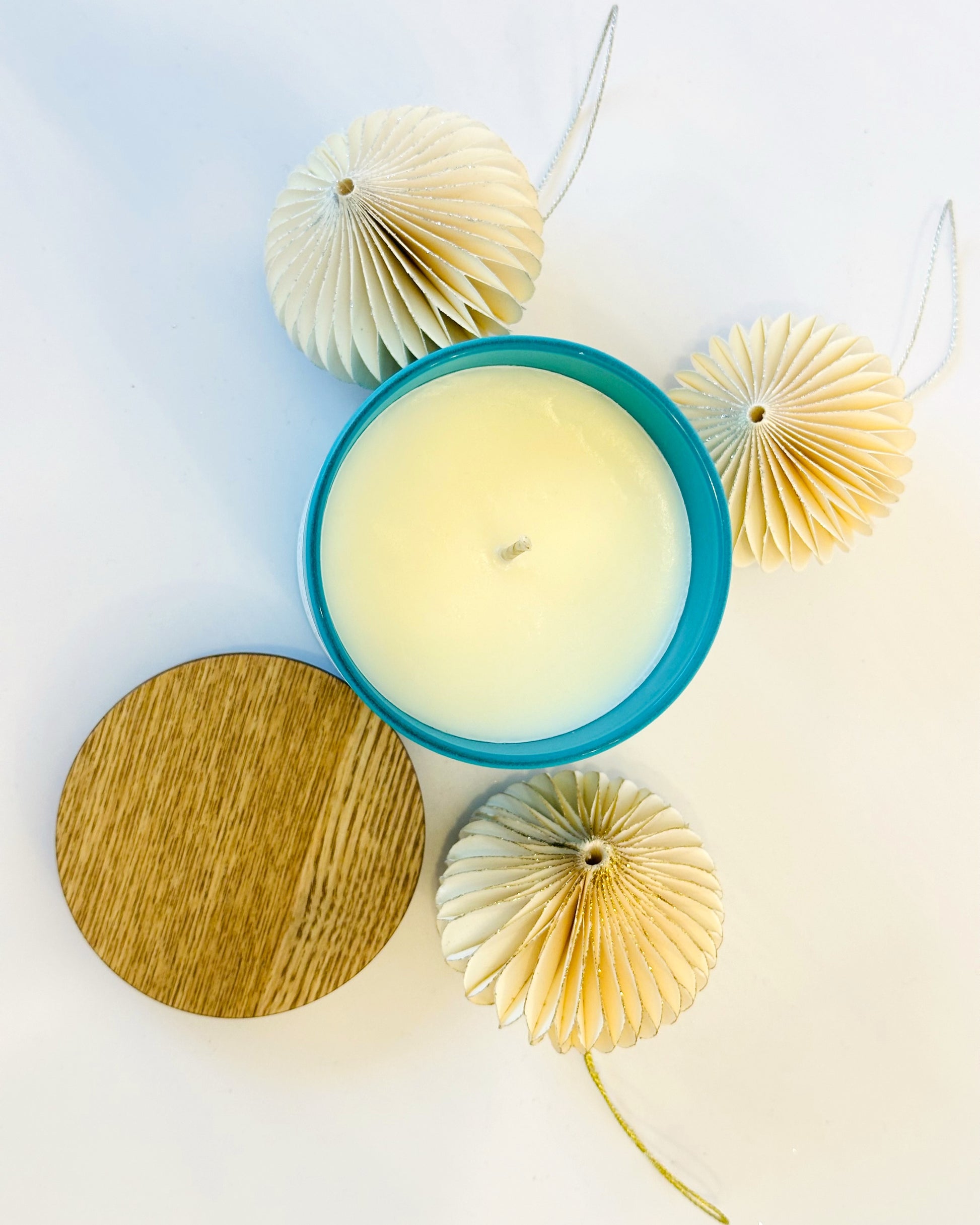 Recipient: din sticlă special conceput pentru lumânări (rezistă la temperaturi ridicate) cu capac din lemn.
